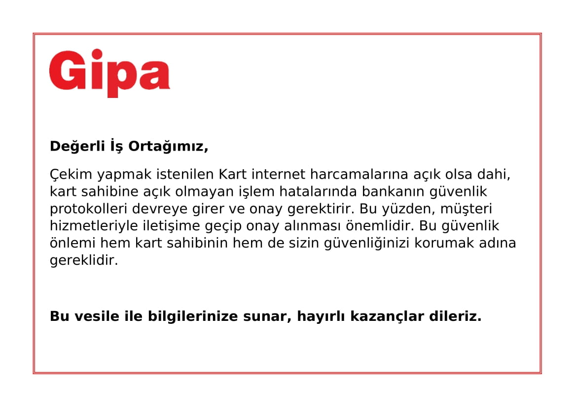 Değerli İş Ortağımız,Çekim yapmak istenilen Kart internetharcamalarına açık olsa dahi, kart sahibine açık olmayan işlem hatalarındabankanın güvenlik protokolleri devreye girer ve onay gerektirir. Bu yüzden,müşteri hizmetleriyle iletişime geçip ona...
