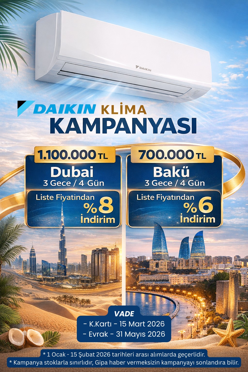Daikin Klima Kampanyamız başlamıştır,* 1 Ocak - 15 Şubat 2026 tarihleri arası alımlarda geçerlidir. * Gipa haber vermeksizin kampanyayı sonlandıra bilir.VADE- K.Kartı - 15 Mart 2026- Evrak - 31 Mayıs 2026